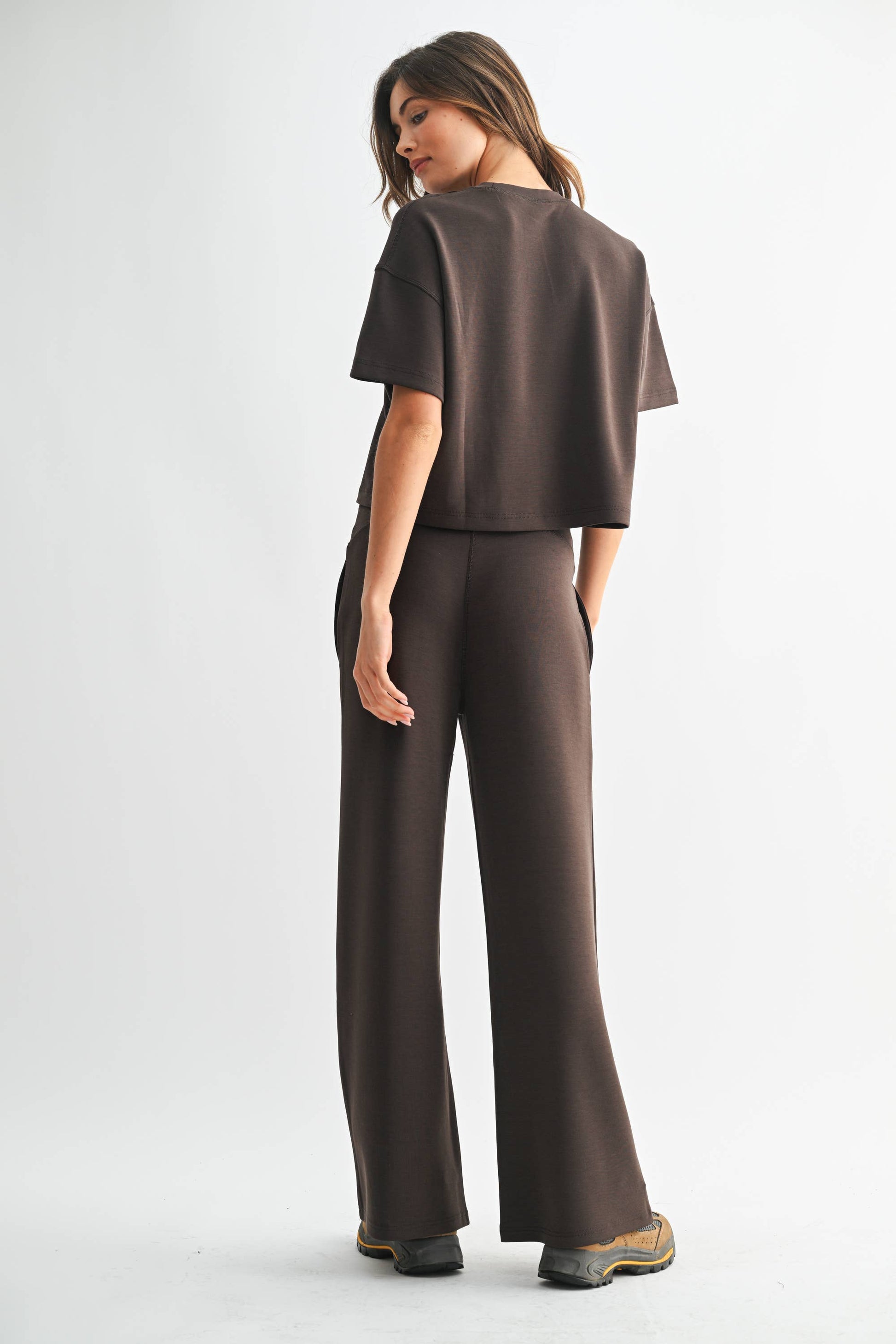 City polish meets coastal ease in the Laguna Flow Set. Crafted from our buttery-soft, lightweight scuba fabric, this elevated essential set includes a relaxed tee with a slight drop shoulder for a modern drape and ease of movement. The matching pants feature a smooth, wide fold-over elastic waistband and side pockets for function without compromising form. With a 30" inseam and clean silhouette, this set is your new uniform for refined lounging or effortless street style.
