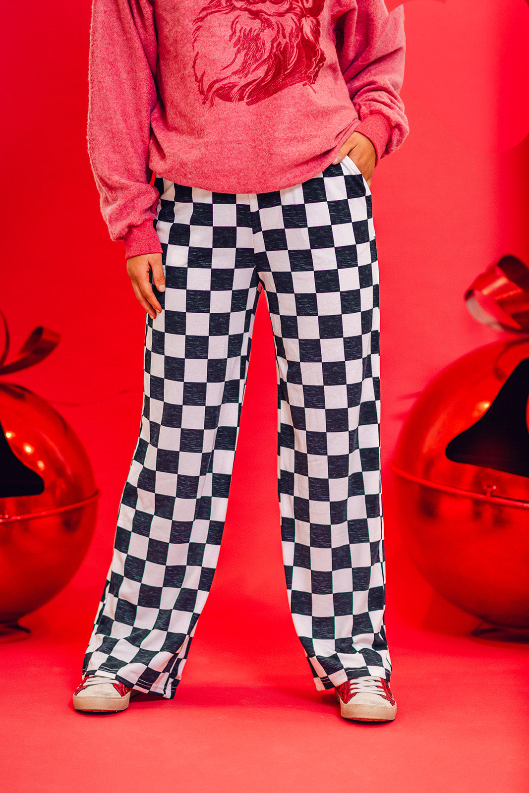 Embrace a bold fashion statement with these striking two-tone checked pants. Designed with a high waist to flatter and accentuate your natural waistline. Enjoy a comfortable, roomy fit with the wide-leg cut for a retro-inspired look. Achieve a stylish and modern silhouette with the high waist and wide legs.