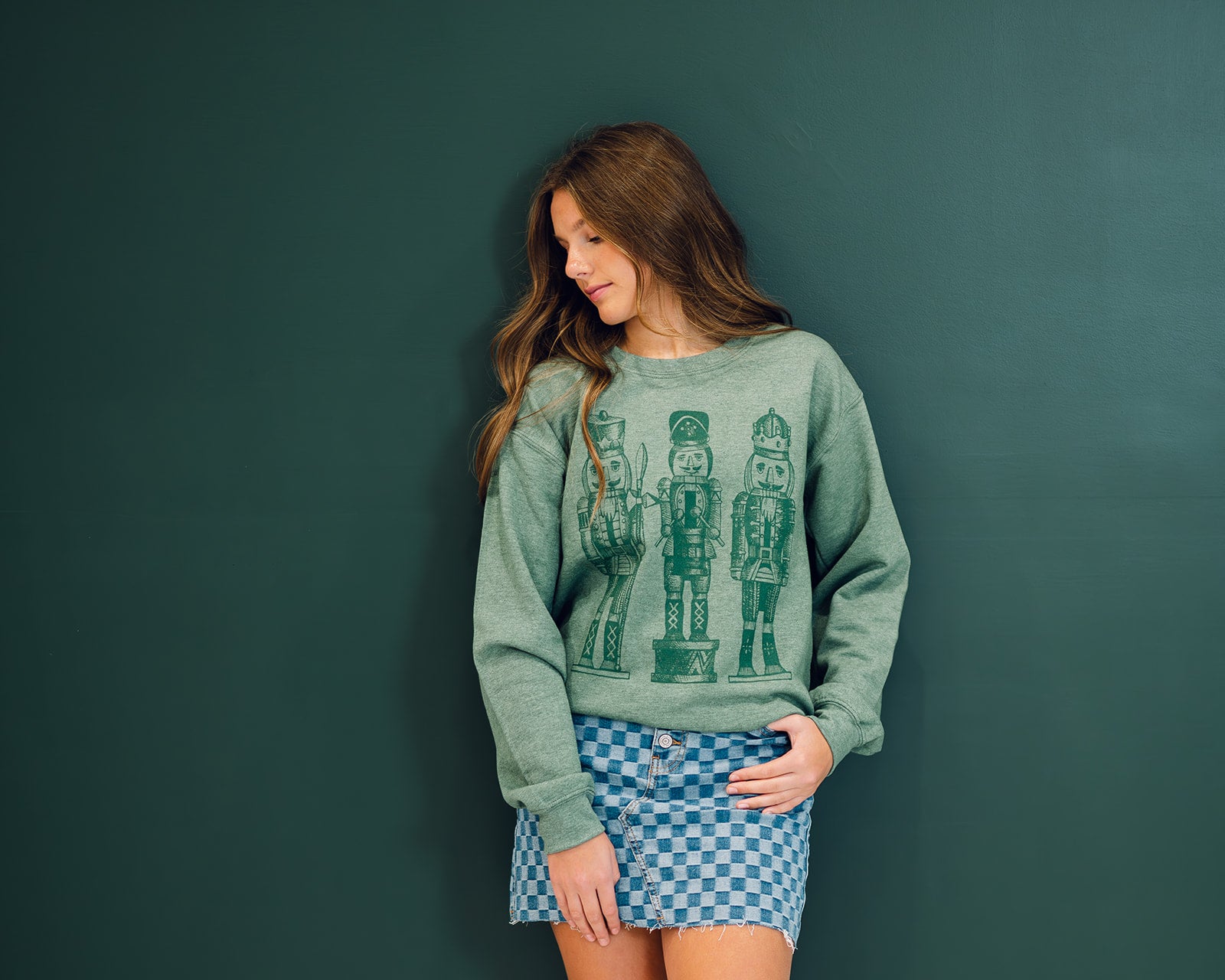 Add a touch of holiday cheer to your wardrobe with our Forest Monochrome Nutcracker Sweatshirt. Featuring a heather forest base with playful green nutcrackers, this cozy sweatshirt is perfect for spreading Christmas joy. 'Tis the season to be jolly, and this festive top will have you feeling holly jolly all season long!