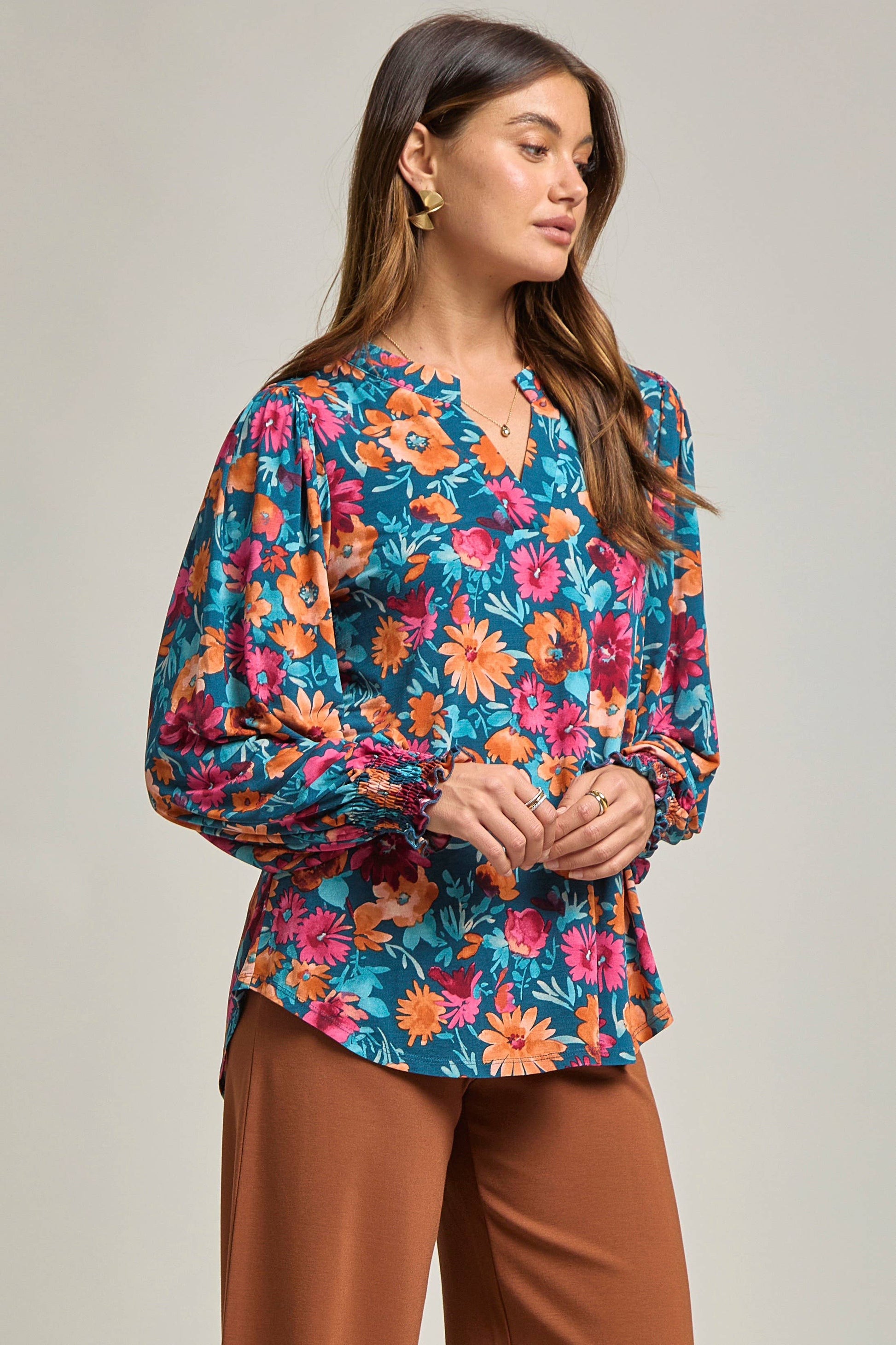 This charming top combines effortless elegance with everyday comfort. Featuring a mandarin collar and subtly puffed sleeves, it’s designed with a feminine touch that stands out. The smocked detailing on the sleeves adds a delicate finish, while the wrinkle-free fabric ensures you stay polished all day long.